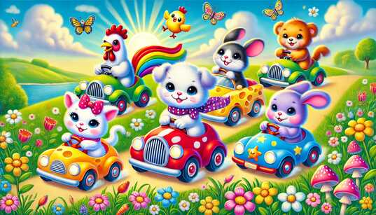 Zvířátka si užívají společnou dobrodružnou cestu. Každý řídí své malé autíčko a společně jedou na výlet. Dobrá nálada jim vykouzlí úsměv na celý den. Vypadá to na parádní jízdu.